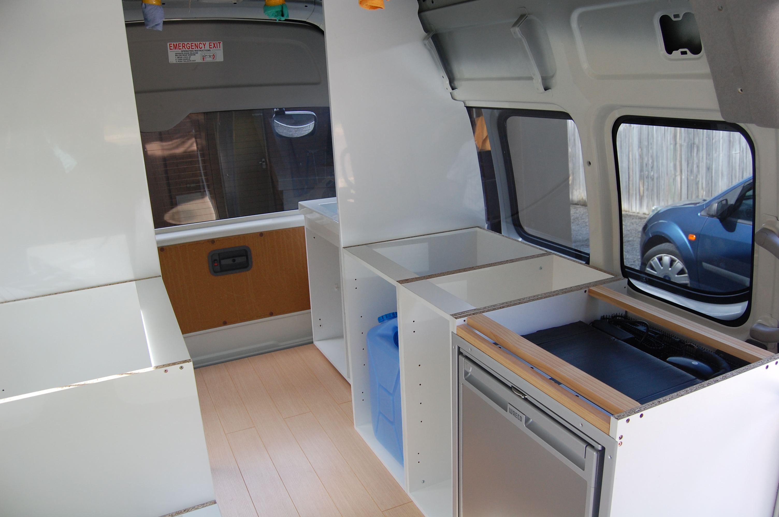 A few weeks ago, I bought some beautiful red gingham material, which would be perfect for the quintessential campervan curtain. Since then, I have been looking, unsuccessfully, for some upholstery fabric to match. The stripy fabric that Paul’s so keen to use for the seat covers would clash horribly. Plain red fabric would work well with the gingham, but next to all the red cupboards might create an ambience more ‘brothelesque’ than would be desireable. So I have reluctantly admitted defeat. There will be no gingham in this campervan. We have bought the bright stripy fabric for the seats and I am now on the search for a plainer fabric for the curtains.