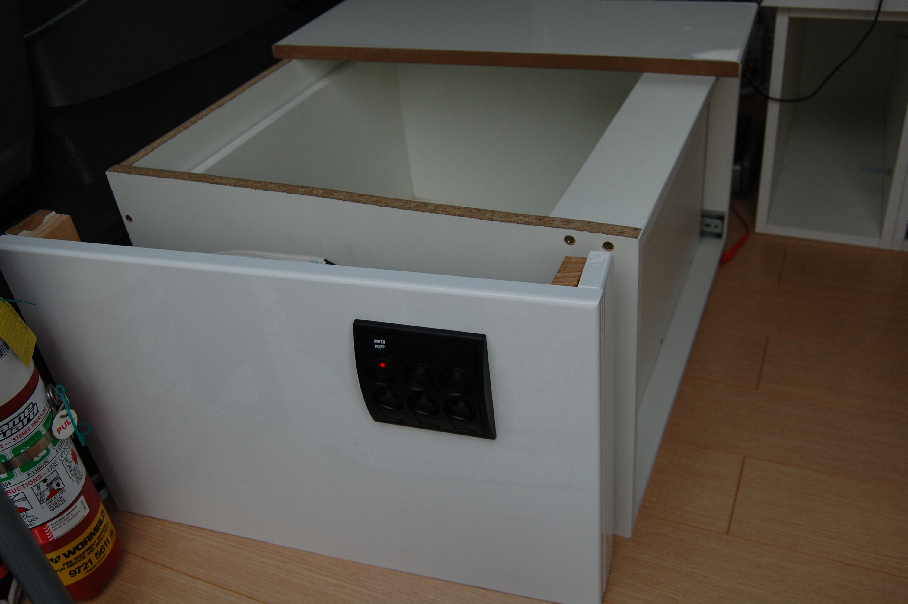 We’ll use the control panel to switch on the lights, fans and water pump. The water pump sits to the left of the fridge, so the cable runs around the fire extinguisher above, through the top conduit in the doorway and past the fridge to the pump.