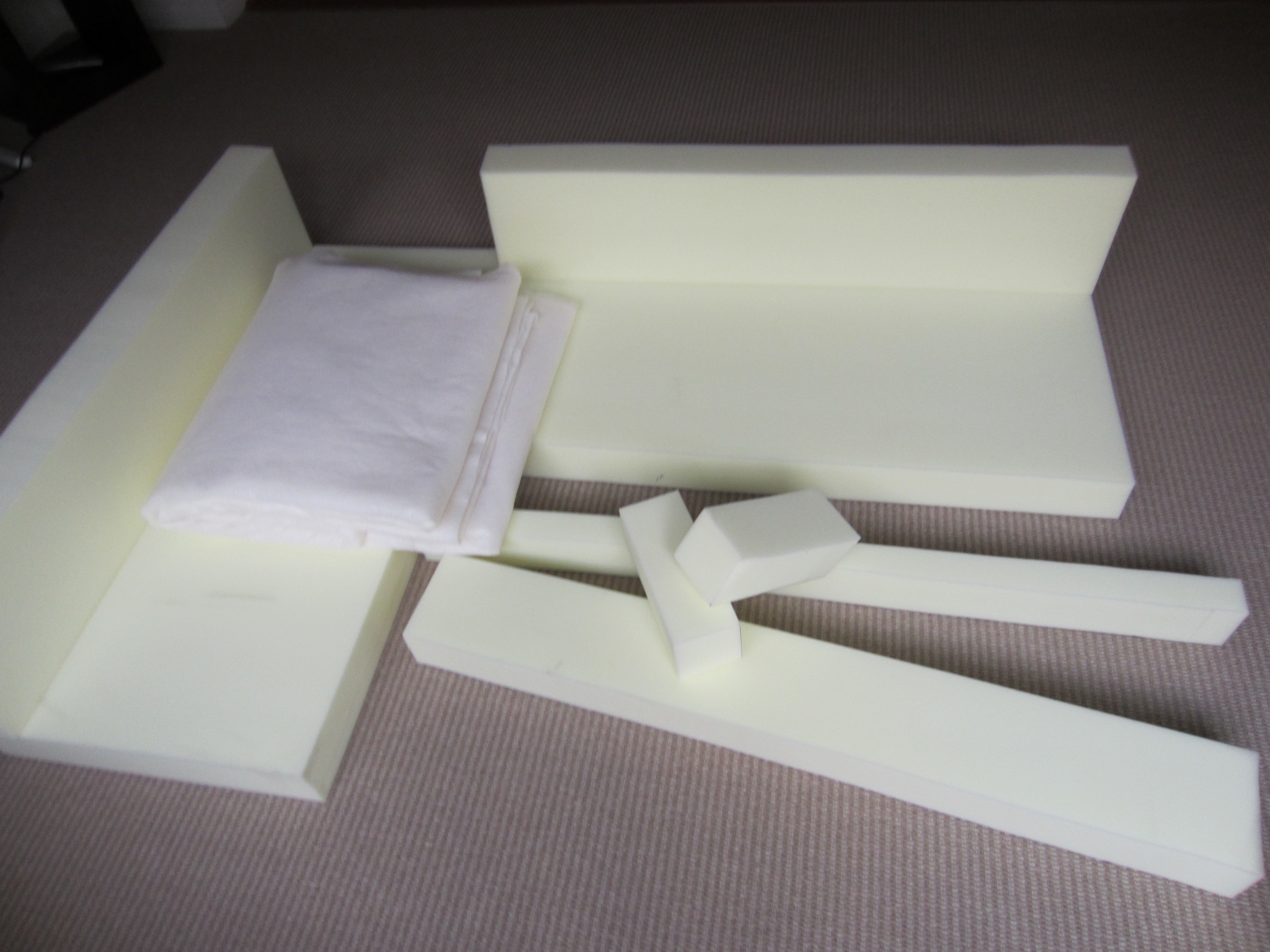 If you’re close to a Clark Rubber store, they will cut foam to your measurements. Otherwise if you’re confident with an electric meat carver, you can buy a foam camping mattress, mark on the measurements and do it yourself. (Note – it is MUCH harder carving foam in a straight vertical line than it is a roast pork.) Whichever method you use, choose a high density foam – particularly if you’ll be using the seat cushions to convert into a bed or if they’re in high traffic areas.