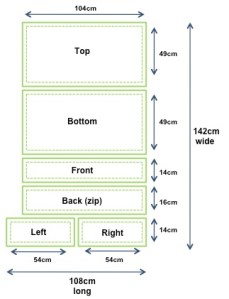 Carefully cut out your 6 panels, similar to the diagram here (but with your own measurements). Remember the 2cm seam allowance on each end. The back panel will contain the zip and be cut in two lengthways so allow an extra 2cm on this measurement, 1cm for each half. (If you want to give yourself a bit more leeway, you can always use 2cm for each half.)