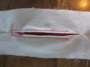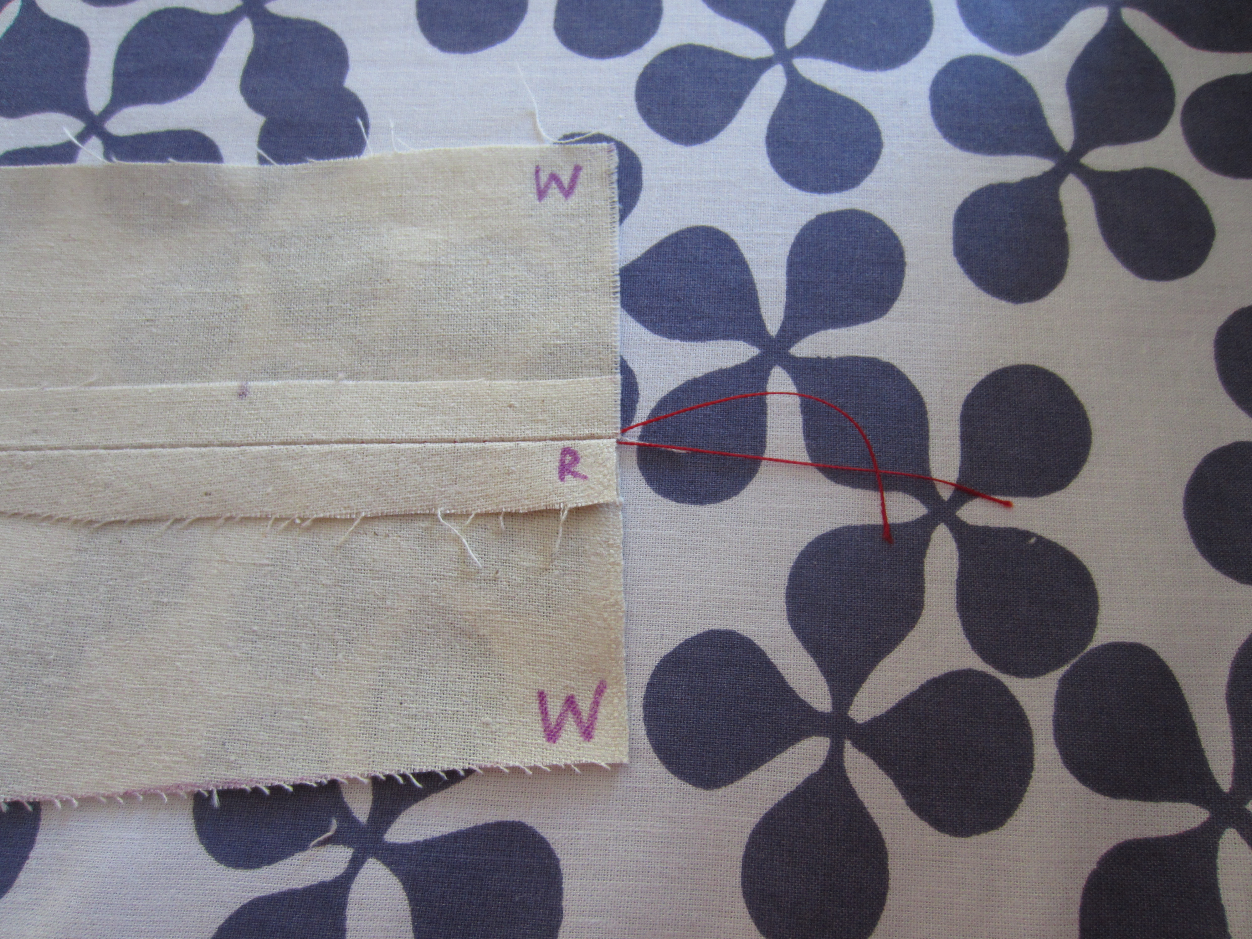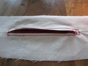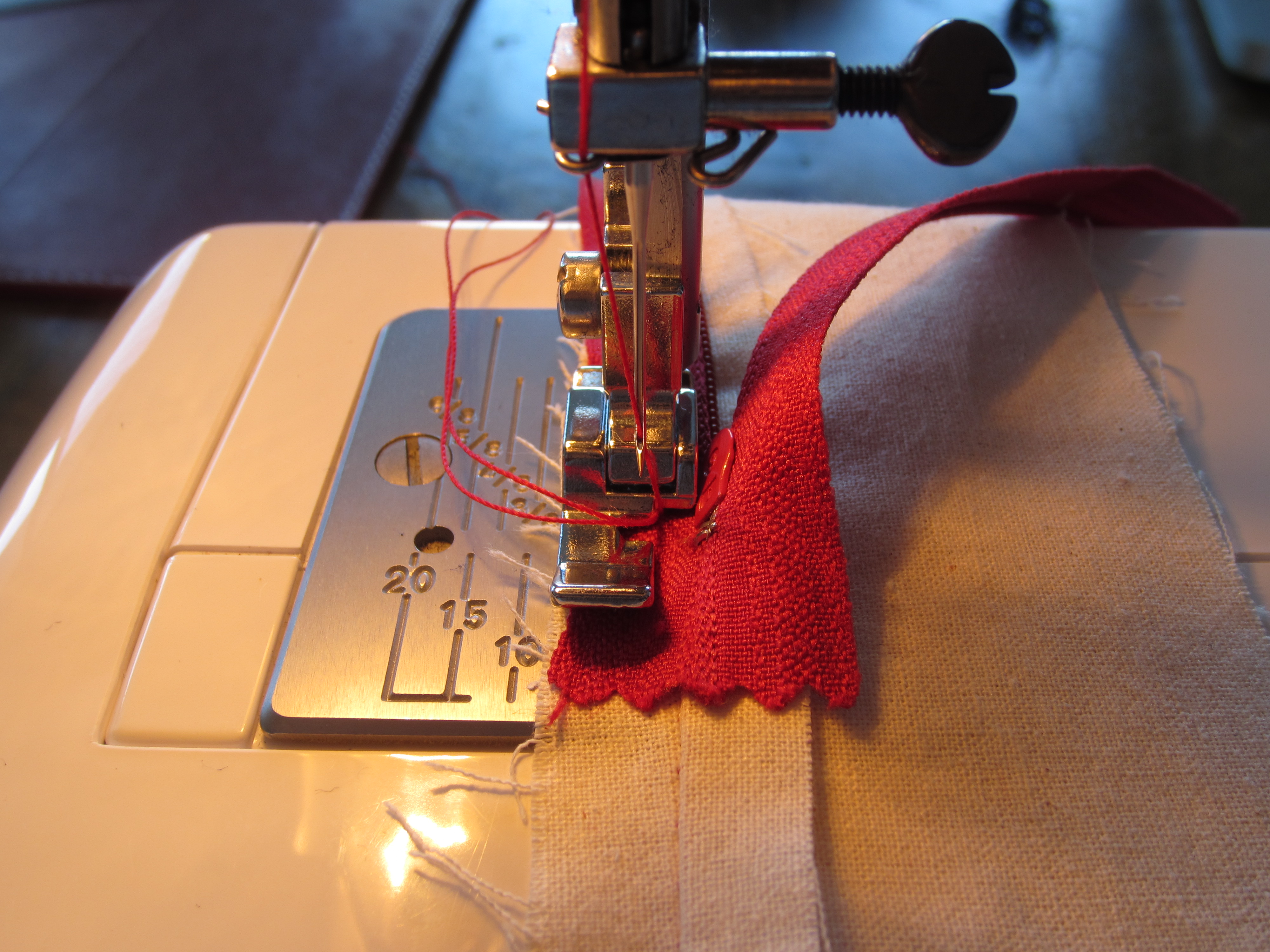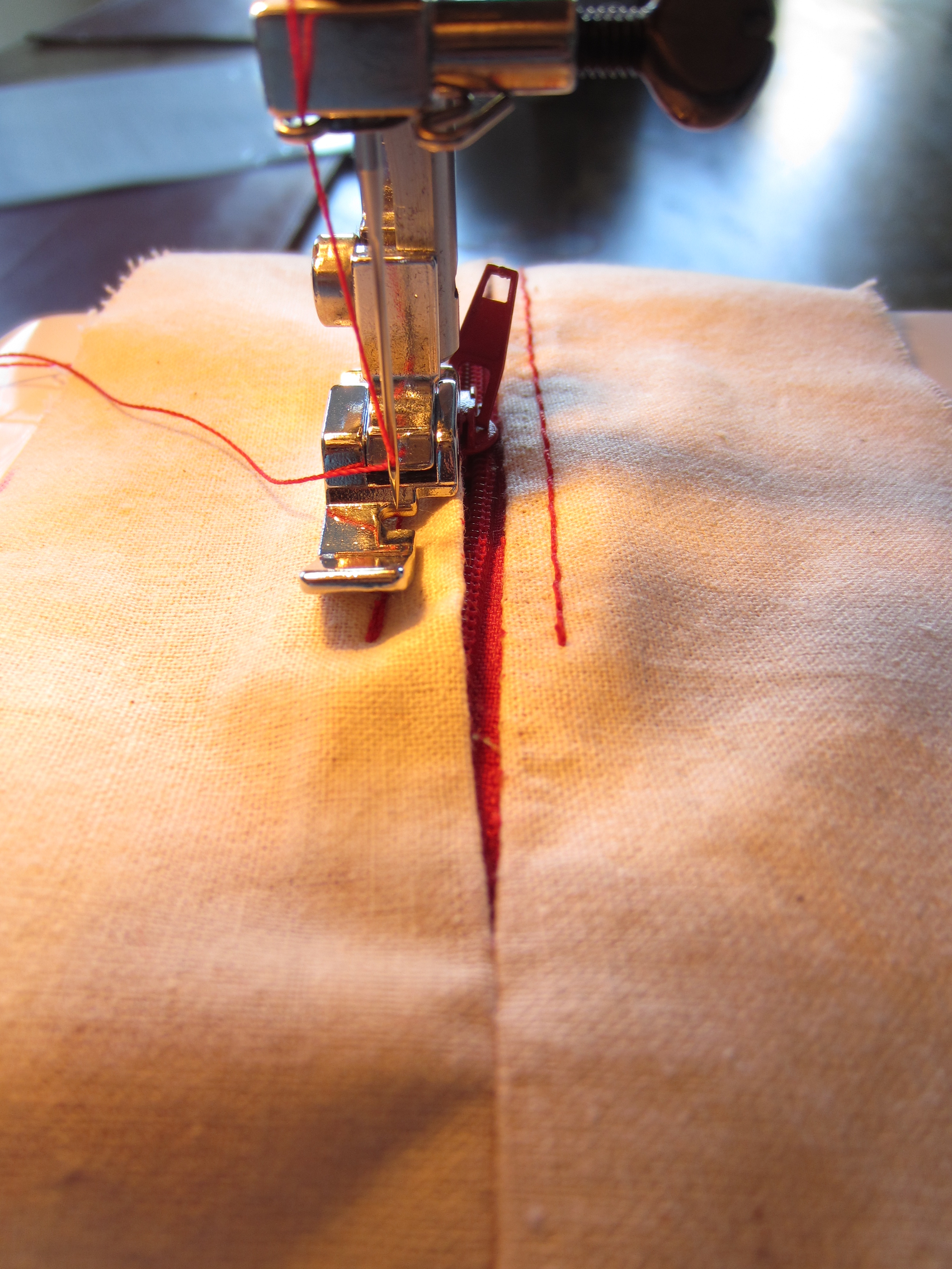 In the following photos I’ve demonstrated the steps on a prototype using cream fabric with red thread, which shows up more easily. Of course it also shows up mistakes and wonky lines more easily – these will be nicely disguised if you’re using matching fabric, thread and zip, so yours will look much better than this!