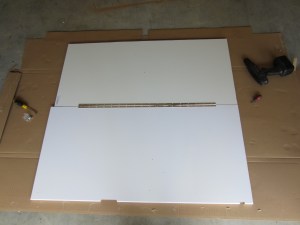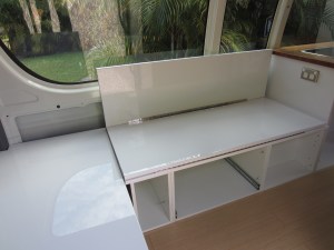 The kitchen work surfaces are also now secure, having been screwed down to the cabinet shell underneath with small right angle brackets. Paul fitted a gloss white side panel onto the cabinet containing the fridge, and added a water indicator, which will link to the fresh and wastewater tanks.